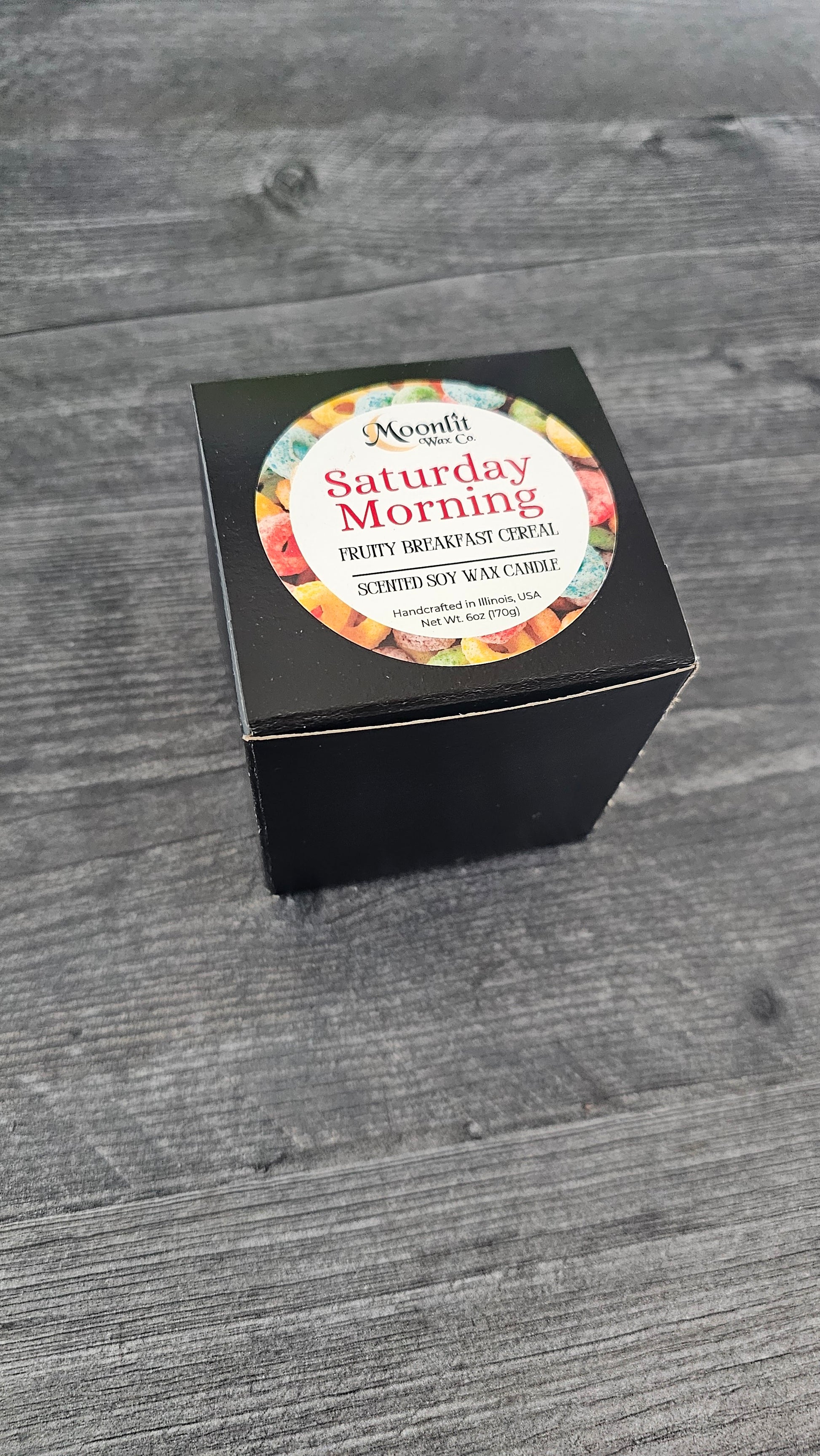 Moonlit Wax Co Candles are highly scented, non toxic, and made with natural soy wax. 8oz black tin with wood grain look lid. Approximately 6oz wax.
